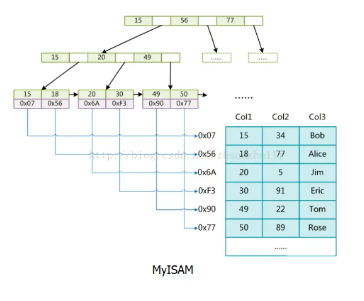 在MYSQL中存储引擎用类似的方法使用索引,先在索引中找到对应值,然后根据匹配的索引记录找到对应的数据行。