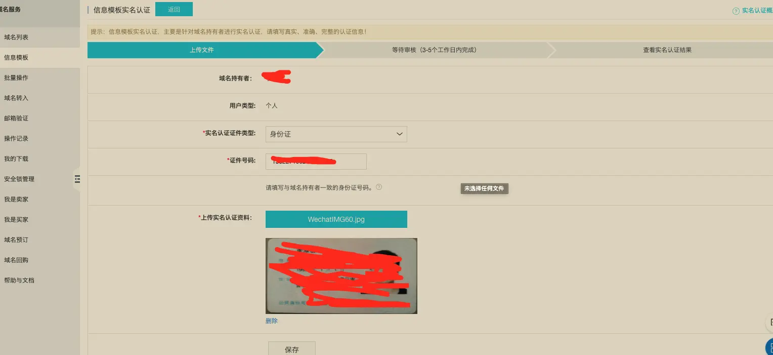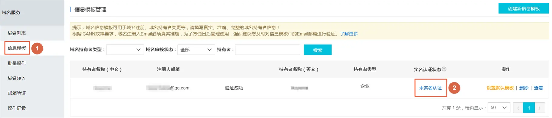 有了域名以后我们需要实名认证,我们去域名管理页面
