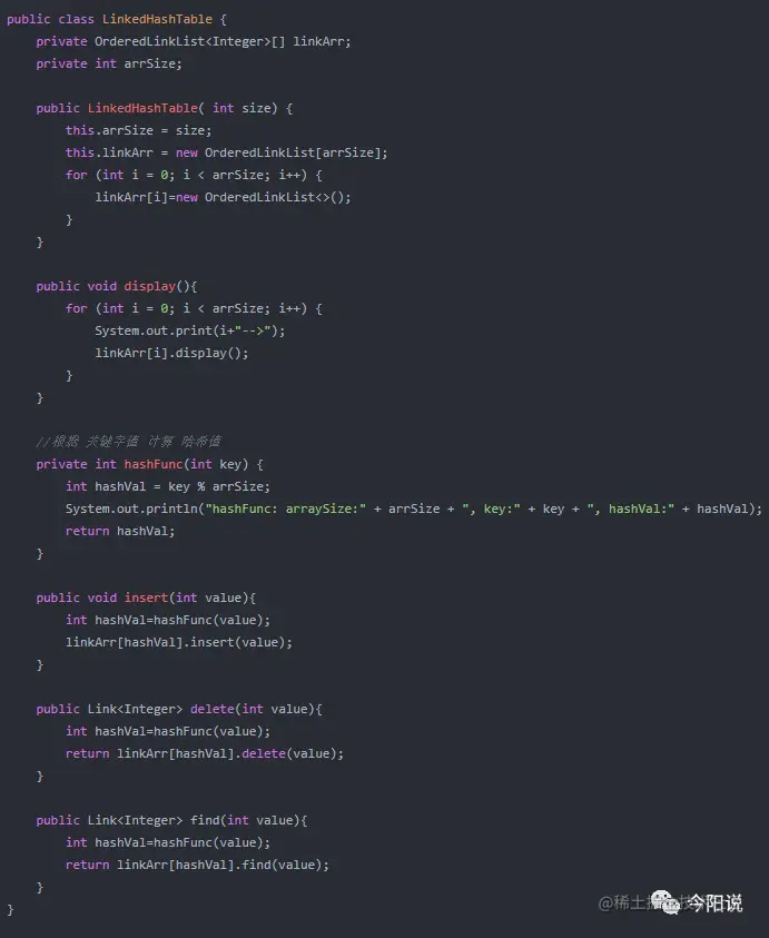 这里因为Link是之前实现链表时写的,只有data字段,就不在改了,理想的Link应该有key(做关键字),value(即data,数据域)两个字段方便使用;代码中的OrderedLinkList即有序链表的实现类,可以参考之前的文章《数据结构和算法-5.1-单链表&有序链表》;