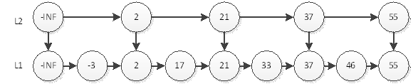 如上图,我们要查询元素为55的结点,只需要在L2层查找4次即可。在这个结构中,查询结点为46的元素将耗费最多的查询次数5次。即先在L2查询46,查询4次后找到元素55,因为链表是有序的,46一定在55的左边,所以L2层没有元素46。然后我们退回到元素37,到它的下一层即L1层继续搜索46。非常幸运,我们只需要再查询1次就能找到46。这样一共耗费5次查询。