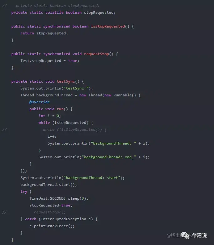 如果方法修改了静态域,那么你也必须同步对这个域的访问,即使它往往只用于单个线程,上面的testVolatile方法就是一个例子;