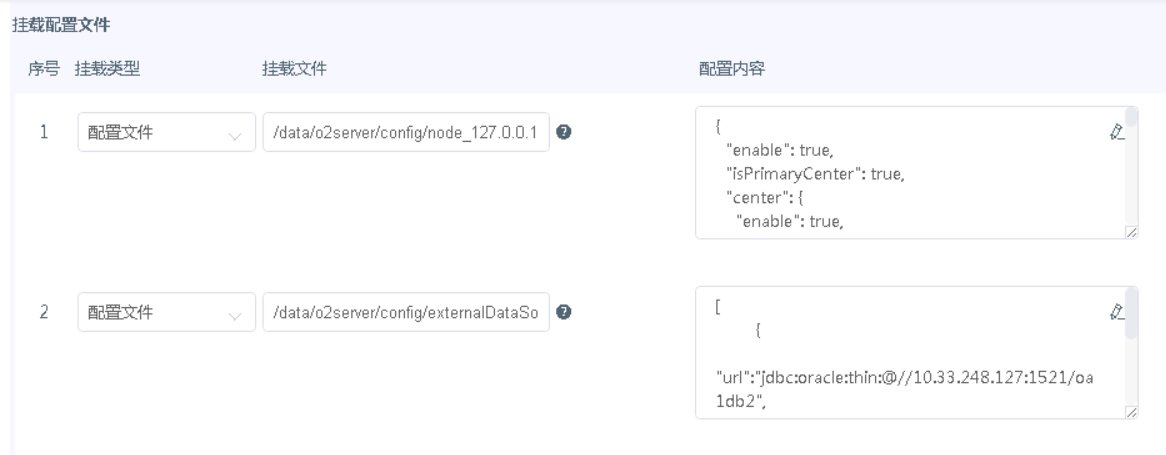 3.2、挂载配置文件node_127.0.0.1.json、externalDataSources.json (将基础服务器配置文件和数据库文件放入PAAS平台管理。在容器启动后,应用启动前PAAS平台会将配置文件写入/data/o2oaserver/config目录下)