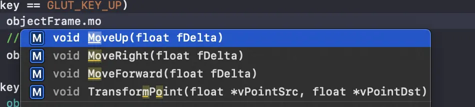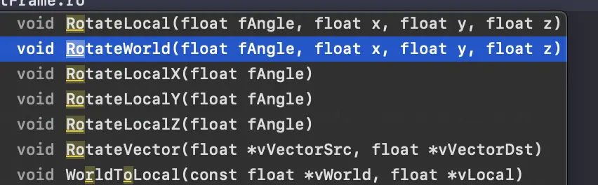 - 在OpenGL中我们可以通GLFrame类表示物体或 观察者的坐标,GLFrame 提供了旋转,移动的函数(MoveForward、MoveUp、MoveRight) 以及RotateWorld 式的旋转函数,可以快速的完成平移以及旋转操作