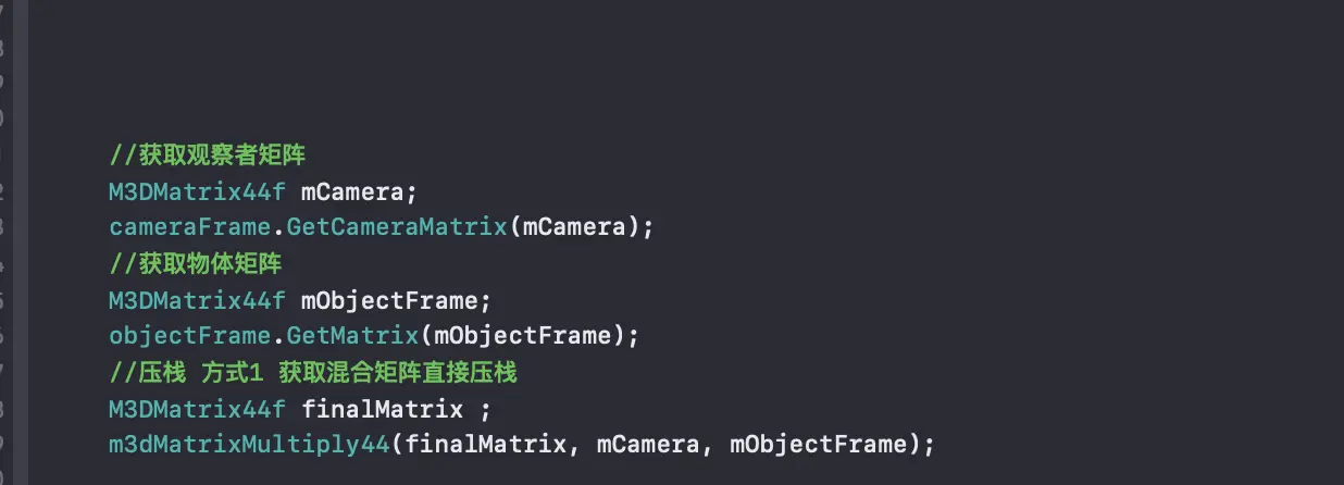 - 通过 void GetCameraMatrix(M3DMatrix44f m, bool bRotationOnly = false) void GetMatrix(M3DMatrix44f m, bool bRotationOnly = false)我们可以很容易的获取到GLFrame对应的M3DMatrix44f 矩阵