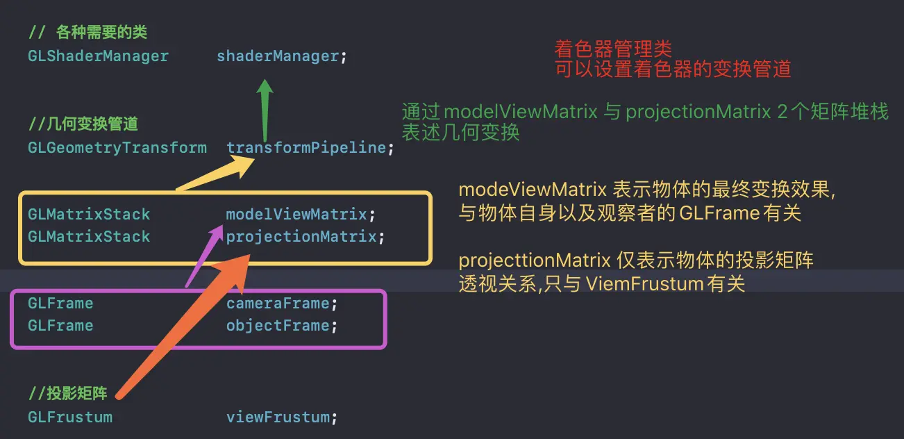 在OpenGL 设置变换管道(GLGeometryTransform)时候我经常使用GLGeometryTransform 类用来管理 模型矩阵 和投影矩阵
