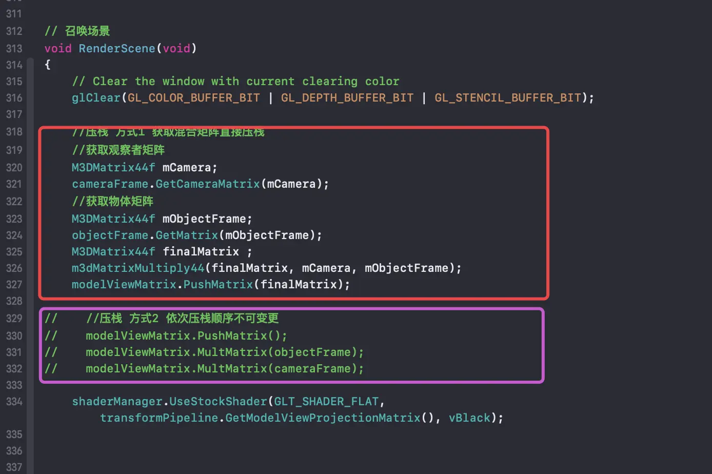 在RenderScene函数中我们通过获取到的模型变换最终矩阵压入到模型视图矩阵堆栈中,这样在 GLGeometryTransform::SetMatrixStacks 中获取到的就是我们压栈后的矩阵,当然我们也可以一次也入观察者矩阵与物体矩阵,值得注意的是依次压入是有先后顺序的,建议通过m3dMatrixMultiply44()获取到混合矩阵后压入