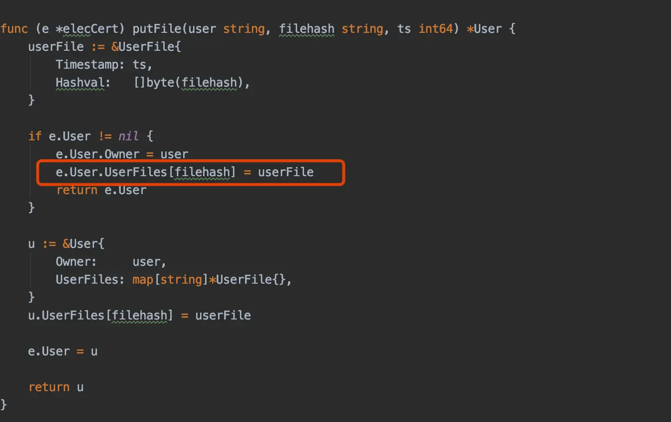 圈红的地方是将单次上链数据userFile 放入map集合中 ,key是filehash,如果2次上传的filehash相同,那么就会把之前的filehash对应的value值给替换掉