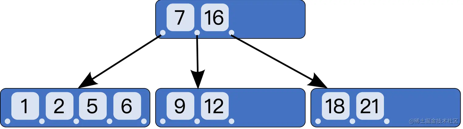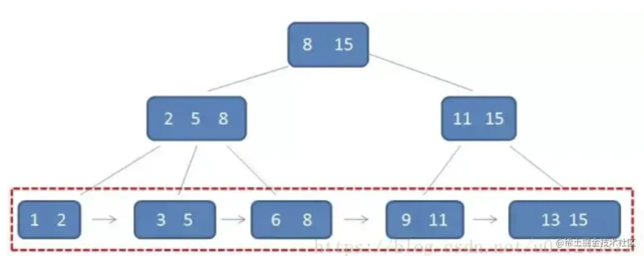 - 所有的叶子结点都位于同一层非叶子节点仅用作索引,它的关键字和子节点有重复元素