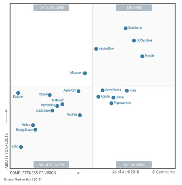 Gartner在2018年专门建立了一个分类,称为高生产力应用平台(hpaPaaS),并预测到2020年位置,超过50%的企业应用将通过hpaPaaS平台搭建。在我最近访问的一些IT主管中已经有不少在评估甚至使用相关的工具。