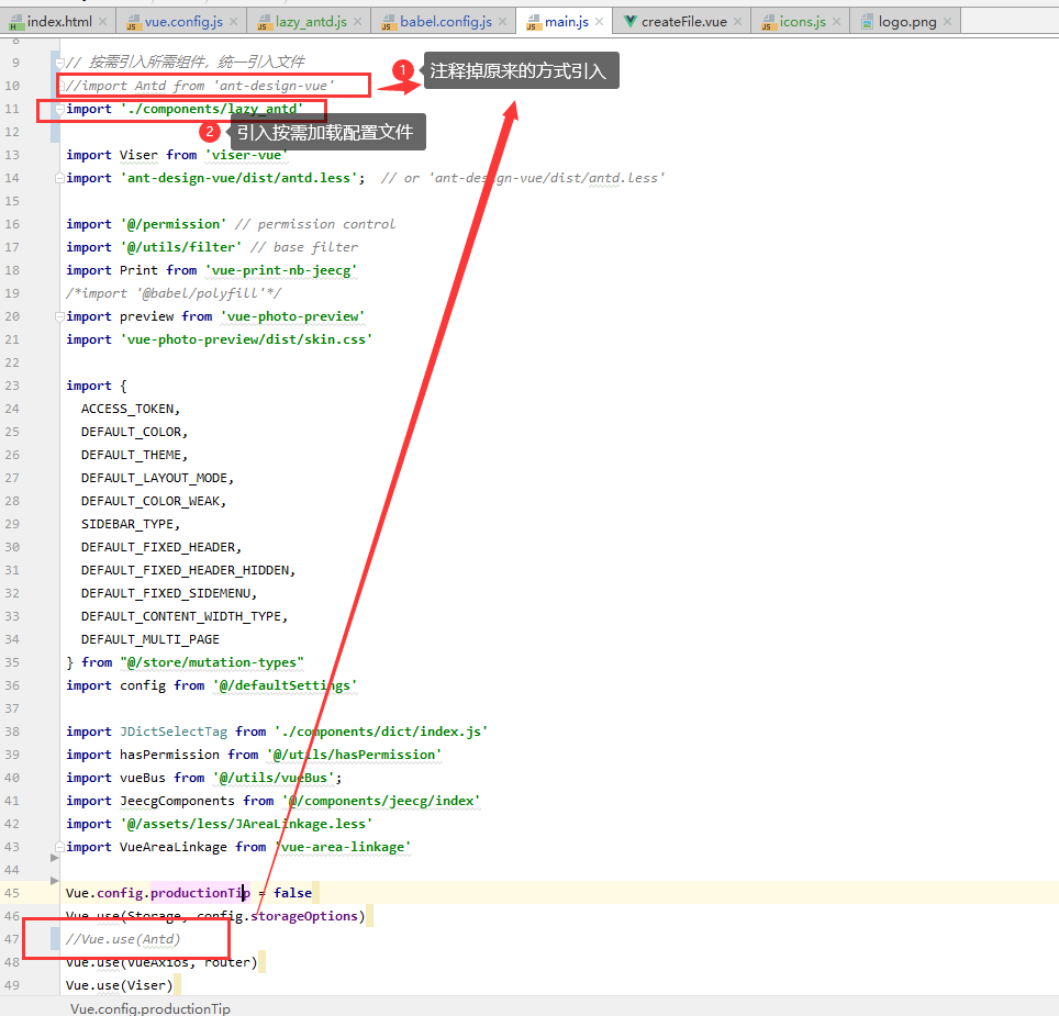 修改main.js 引入配置文件 src/components/lazy_antd.js,同时注释掉原来的 ant-design-vue引入。