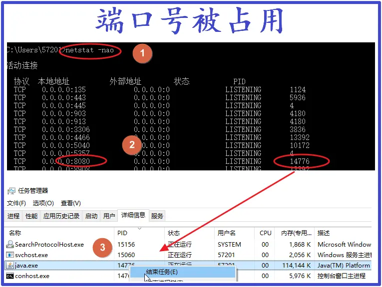 在详细信息中,根据PID找到对应的运行程序,将其结束即可。