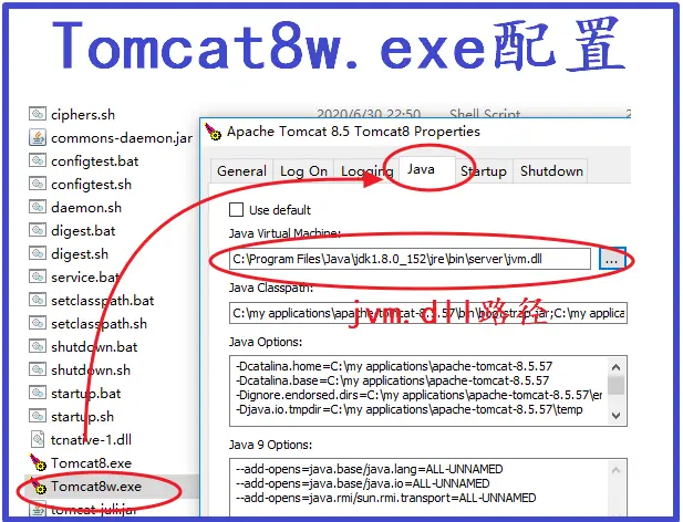 在Tomcat安装目录下有一个Tomcat8w.exe文件,将jvm.dll的文件路径配置进去即可。