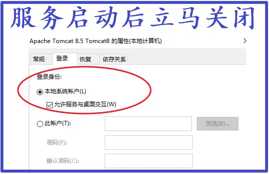 右键属性,选择登录选项卡,将登录身份改成本地系统账户,允许服务与桌面交互。