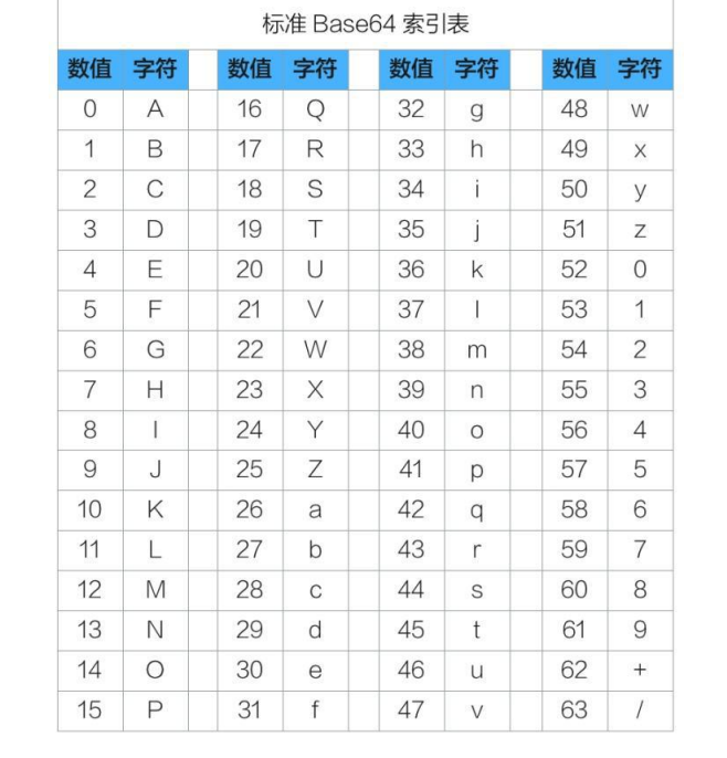 原理: base64 编码的原理是先将源文件以标准字节(byte)为单位转化成二进制,一个字节占8 个位(bit),如“ABC”的二进制是01000001、01000010、01000011,这样源文件就形成了 每 8 个 bit一组的一串二进制,然后将这些二进制串以base64特有的规则(每个字节占 6 个位)再转化成base64格式的字符(如下图),编码完成,解码就是这个过程反过来