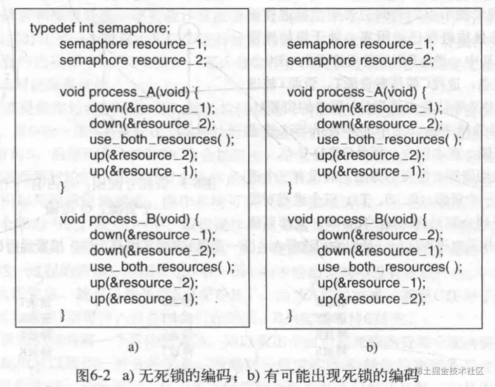 不同的资源获取方式可能造成死锁,如果是使用信号量操作,那么可能的情况如下所示: