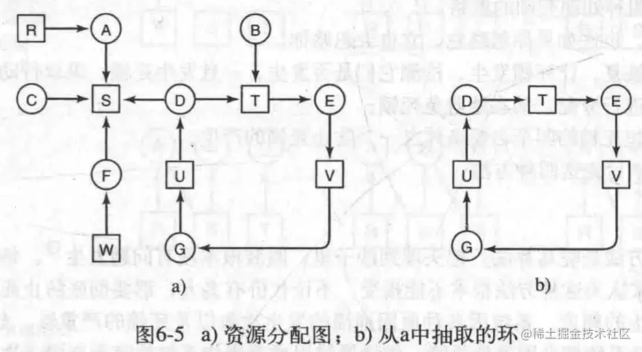 4. 环路等待条件。死锁发生时,系统中一定有两个或两个以上的进程组成的一条环路,该环路中的每个进程都在等待下一个进程释放资源。