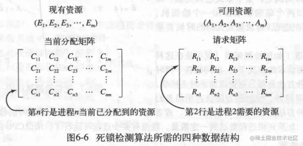 对于进程,有P1-Pn这n个进程,假设资源的类型数是m,E1代表资源类型1,E2代表资源类型2,Ei代表资源类型i(1 <= i <= m)。E是现有资源向量,E1=2就代表第一种资源有两个实例。