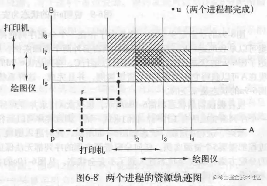 在这里,进程A在L1-L3之间使用打印机,在L2-L4之间使用绘图仪;进程B在L5-L7之间使用绘图仪,在L6-L8之间使用打印机。虚线代表指令执行记录,横向是A的指令,纵向是B的指令。