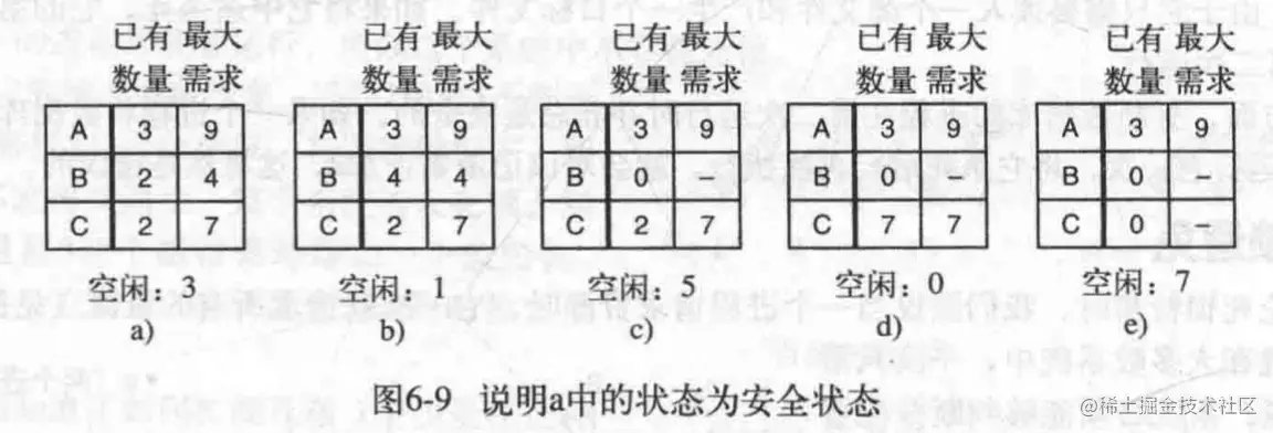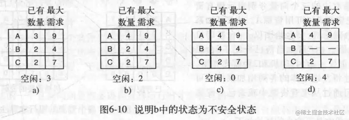 如果某时刻1没被满足,说明出现死锁进程。是不安全状态。