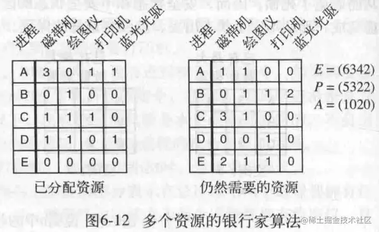 E是全部资源,P是已分配资源,A是可用资源。