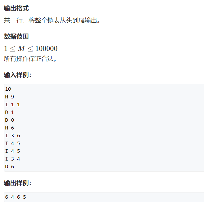 这道题题意非常直白。就是需要实现一个单链表,这个链表支持三个操作:(1)在链表的表头插入一个节点;(2)删除某个数后面的数;(3)在某个数后面加入一个数(即插入节点)。 输入有若干行,每行都有可能是三个操作的其中之一,最后的输出就是经过所有操作之后从头到尾将链表输出。