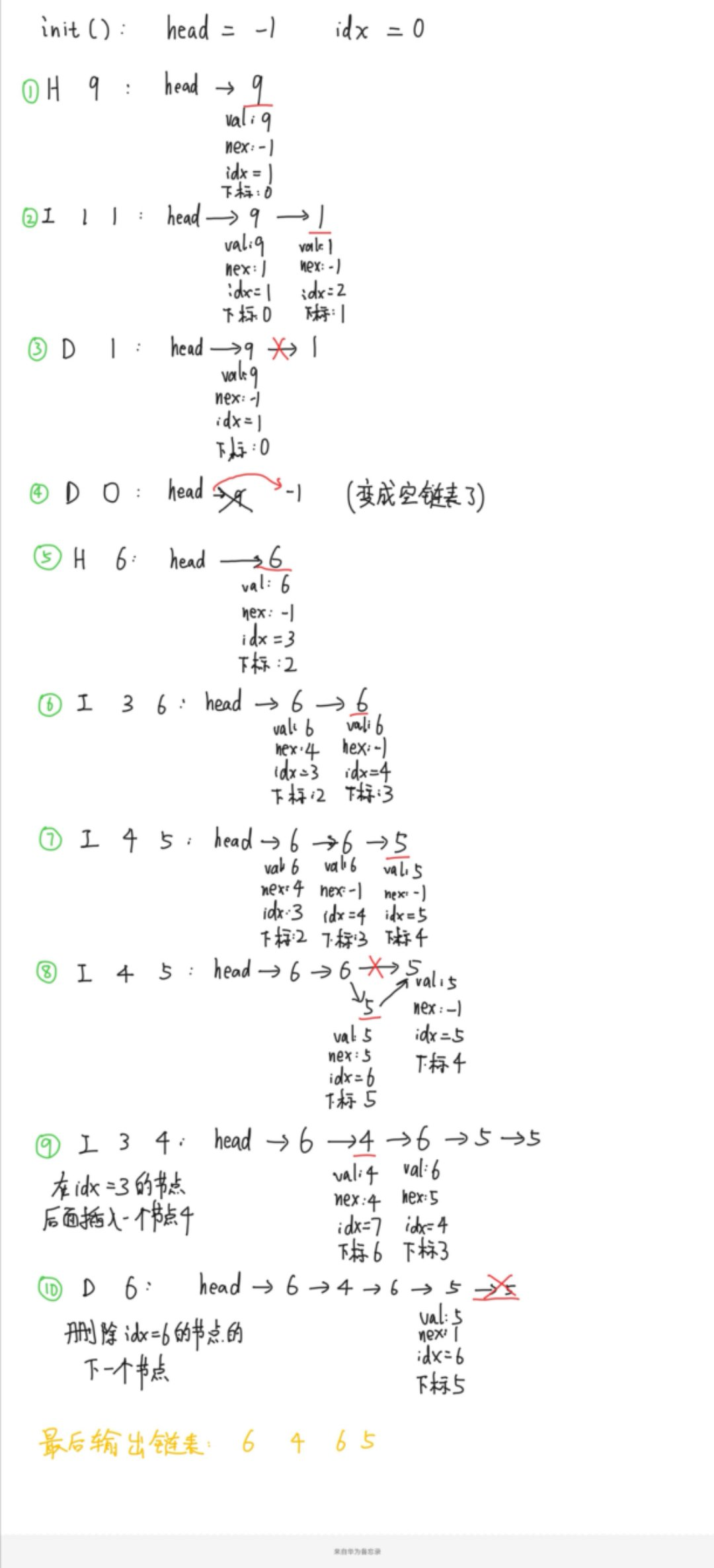 int val[N], nex[N], head, idx; //head表示头节点的下标,idx表示已经插入的节点的个数