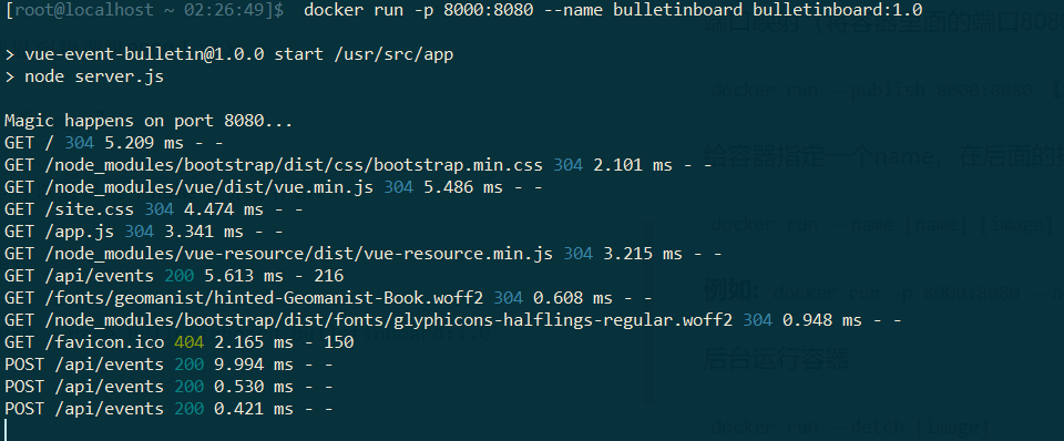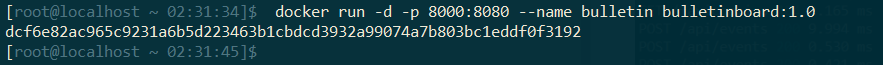 例如: docker run -p 8000:8080 --name bulletinboard bulletinboard:1.0