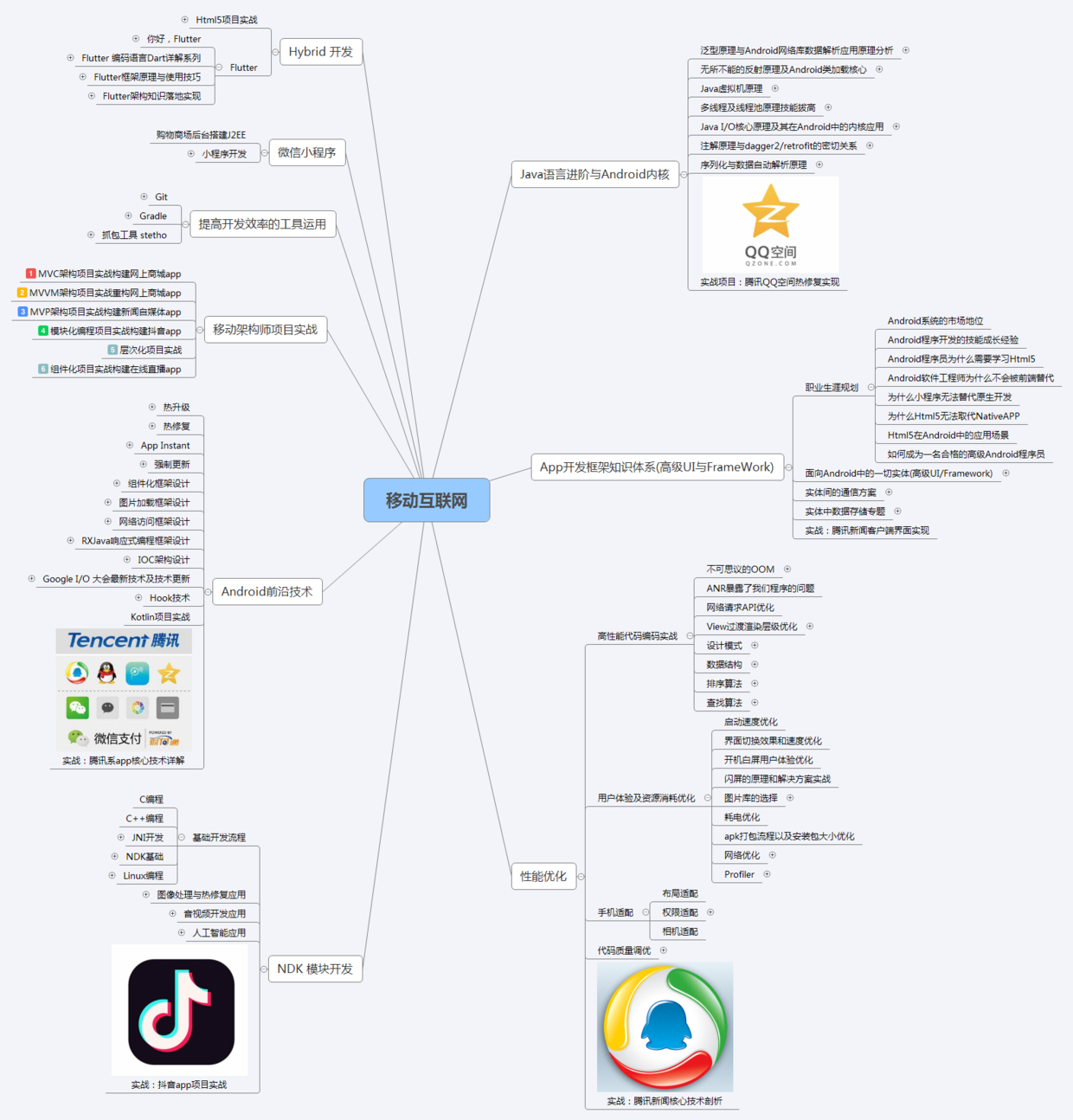 关于视频这块,我也是自己搜集了一些,都按照Android学习路线做了一个分类。按照Android学习路线一共有八个模块,其中视频都有对应,就是为了帮助大家系统的学习。接下来看一下导图和对应系统视频吧!!!