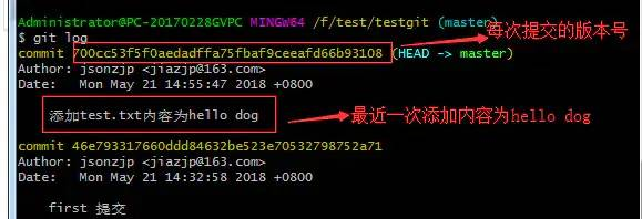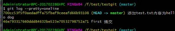 git log命令显示从最近到最远的显示日志,我们可以看到最近三次提交,最近的一次是,增加内容为hello dog.第一次默认是 hello world!.如果嫌上面显示的信息太多的话,我们可以使用命令 git log –pretty=oneline 演示如下:
