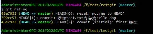git reset --hard 版本号 ,但是现在的问题假如我已经关掉过一次命令行或者hello dog内容的版本号我并不知道呢?要如何知道增加hello dog内容的版本号呢?可以通过如下命令即可获取到版本号:git reflog 演示如下: