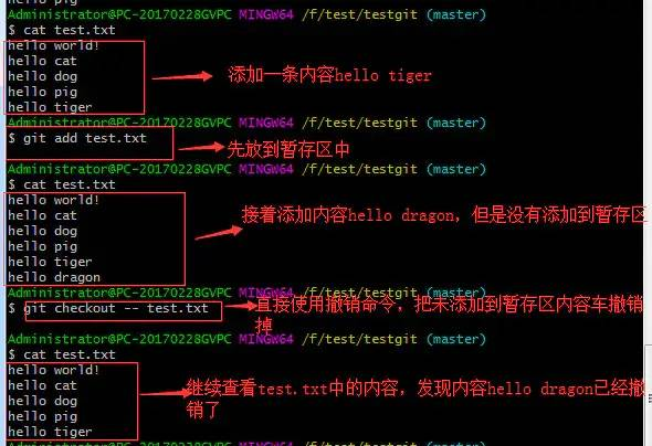 对于第二种情况,我想我们继续做demo来看下,假如现在我对test.txt添加一行 内容为hello tiger,我git add增加到暂存区后,接着添加内容hello dragon,我想通过撤销命令让其回到暂存区后的状态。如下所示: