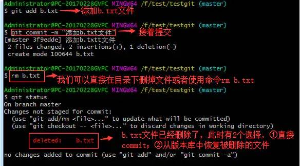 如上:一般情况下,可以直接在文件目录中把文件删了,或者使用如上rm命令:rm b.txt ,如果我想彻底从版本库中删掉了此文件的话,可以再执行commit命令 提交掉,现在目录是这样的,
