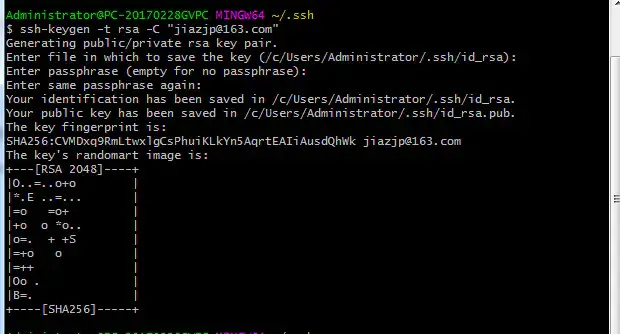 $ ssh-keygen -t rsa -C "你的邮箱"然后一路回车,就会出现如下图: