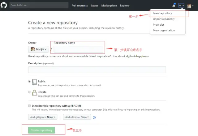 首先,登陆GitHub,然后,在右上角找到“Create a new repo”按钮,创建一个新的仓库: