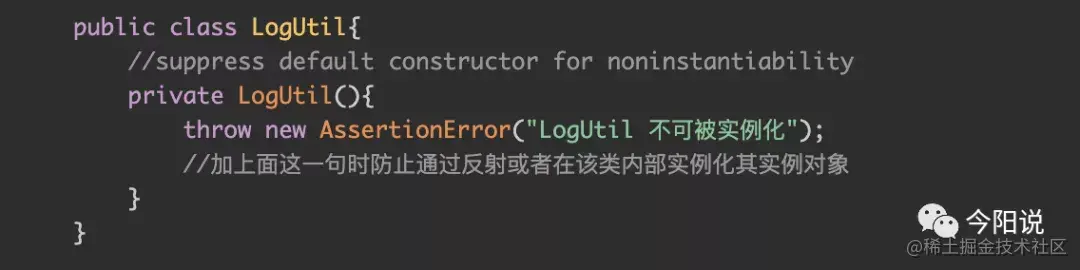 有些类只有静态方法和静态属性,如一些工具类,比如自定义日志工具类LogUtil,我们不希望它可以创建实例,然而一个类在缺少构造器时,系统会默认提供一个公有无参的构造方法,这时我们可以显示的提供一个私有的构造方法,以保证该类不可实例化;