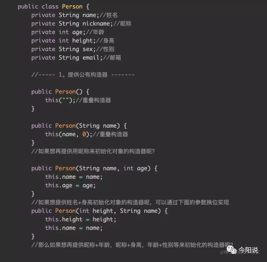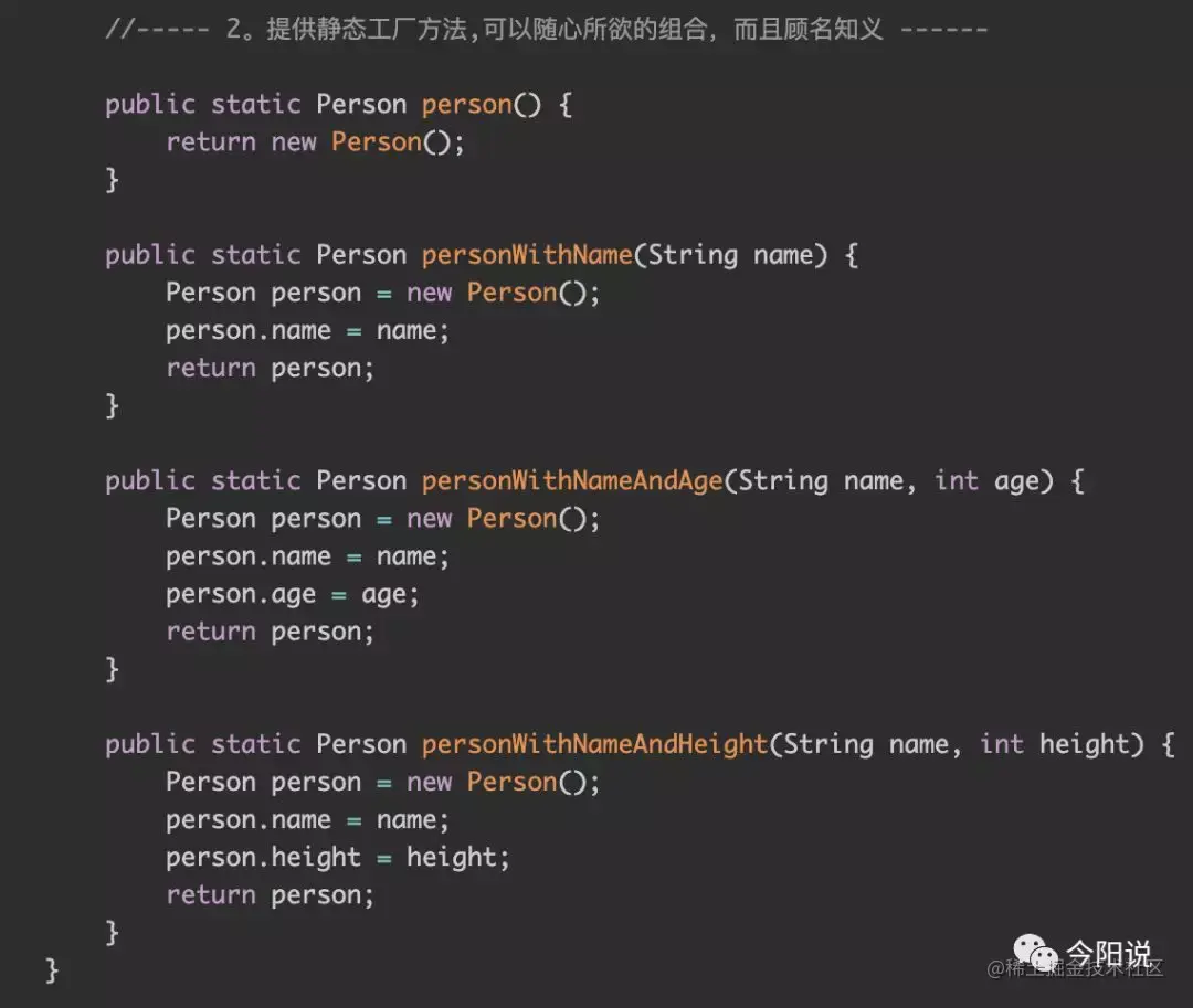 a. 可以随意组合要初始化的属性,通过不同的命名,不仅可以避免构造器的限制(一个类只能有一个带有指定签名的构造器),而且可以做到顾名思义;