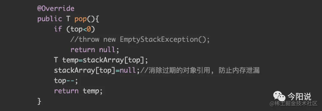 例如:栈实现类ArrayStack,当栈先增长后收缩,栈内还维护着过期引用,这种情况称为无意识的对象保持,那么就需要在pop()方法中将已经出栈的元素设为空;