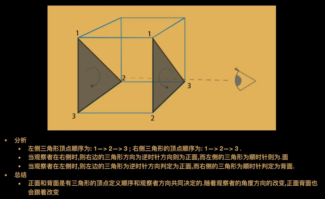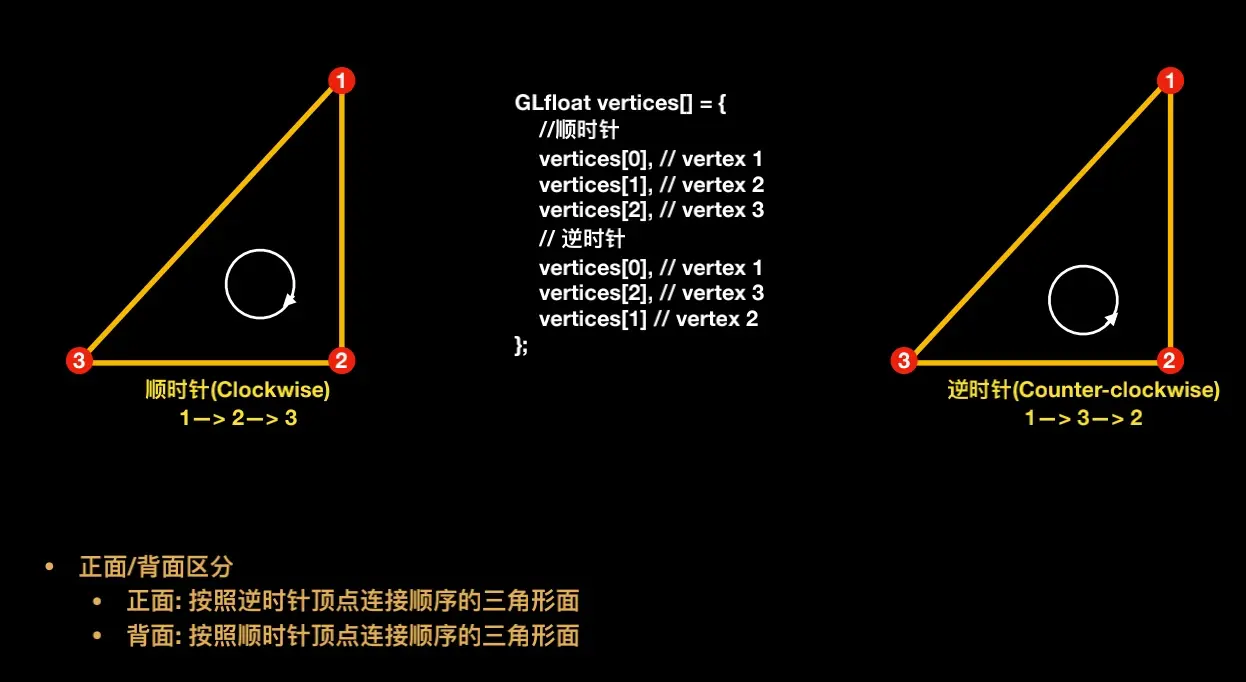 我们可以通过分析顶点数据的顺序来决定, 通过逆时针绘制的就为正面, 通过顺时针绘制的就为反面.