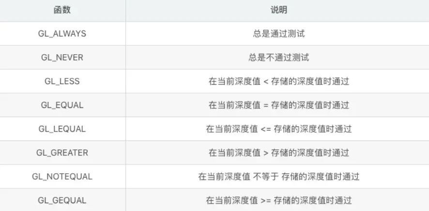 我们可以通过 glDepthFunc(GLenum func); 来修改深度测试的规则: