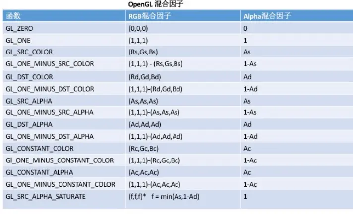 glBlendFunc 指定 源和⽬标RGBA值的混合函数;但是glBlendFuncSeparate函数则允许为RGB 和Alpha 成分单独指定混合函数。