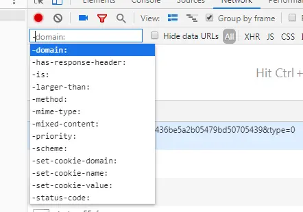 如下图所示:在 Network 这个选项卡的最左边有一个过滤的输入框,你只需要输入 - 就可以看到提示:
