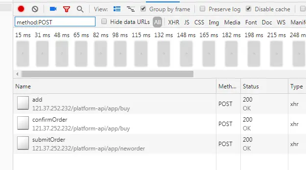 示例如下,如果你想查找所有 POST 里面包含了指定类型信息的请求的话,就可以通过输入method:POST来实现。注意这个表达式前面没有 -(中划线),输入 - 它的目的是为了 让你看到chrome提供了那些高级的选项。
