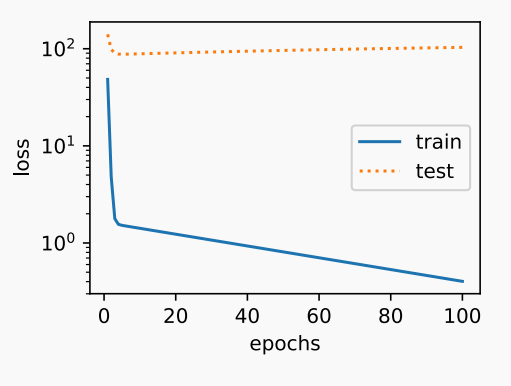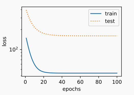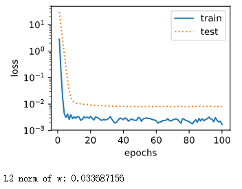 其中噪声项 ϵ 服从均值为0、标准差为0.01的正态分布。为了较容易地观察过拟合,我们考虑高维线性回归问题,如设维度 ;同时,我们特意把训练数据集的样本数设低,如25。