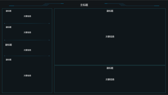 在开发大屏数据可视化项目时,除了各类图表的开发外,大屏的风格设计也是一项十分重要且耗时的工作。 大屏的布局很重要,主次内容的排版是整个大屏的关键。不能让决策人看不到重点信息,也不能让他们忽略次要内容,因此我们就需要学习如何进行区域分布。 模板采用了通用的上下和左中右布局,把整个大屏分隔成了若干区域,方便在具体开发过程中根据实际需要自行调整。配色方面,模板均采用深色背景,把注意力更多的投入到数据上。 布局分布有很多,主要是以下这些类型: