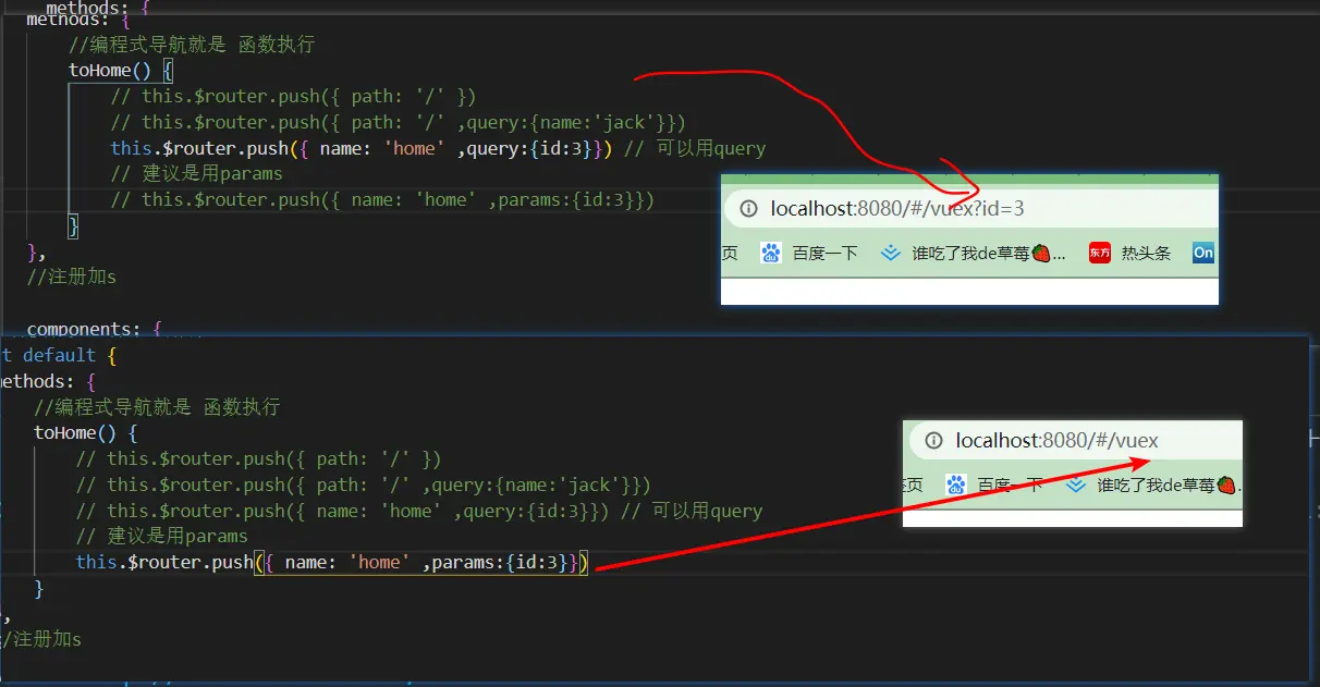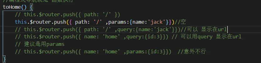 *path 和 Name路由跳转方式,都可以用query传参 *path路由跳转方式,params传参会被忽略,只能用name命名的方式跳转