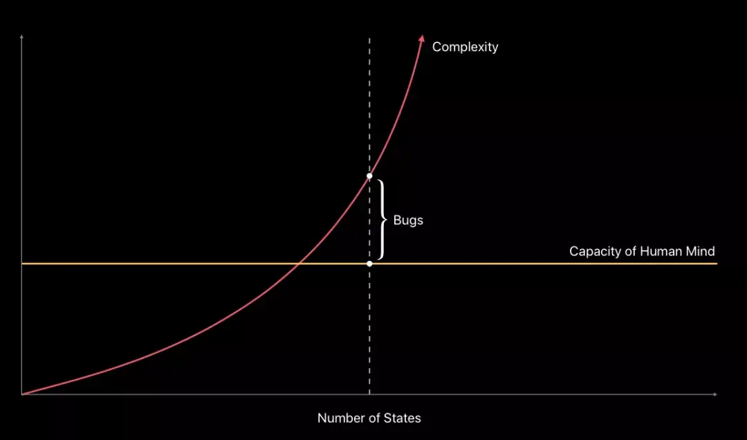 人脑处理状态的复杂度是有限的,状态的复杂度一旦超过人脑的复杂度,就会产生大量的 Bug,并且修掉了这个产生了新的Bug。