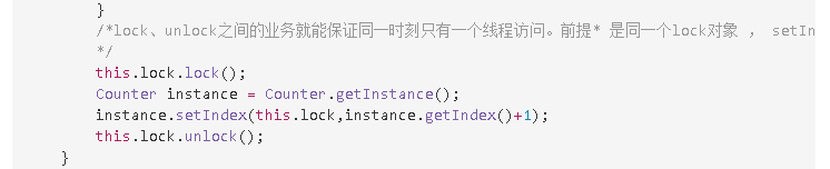 /*lock、unlock之间的业务就能保证同一时刻只有一个线程访问。前提* 是同一个lock对象 , setIndex中也有lock 程序正常运行说明可重* 入