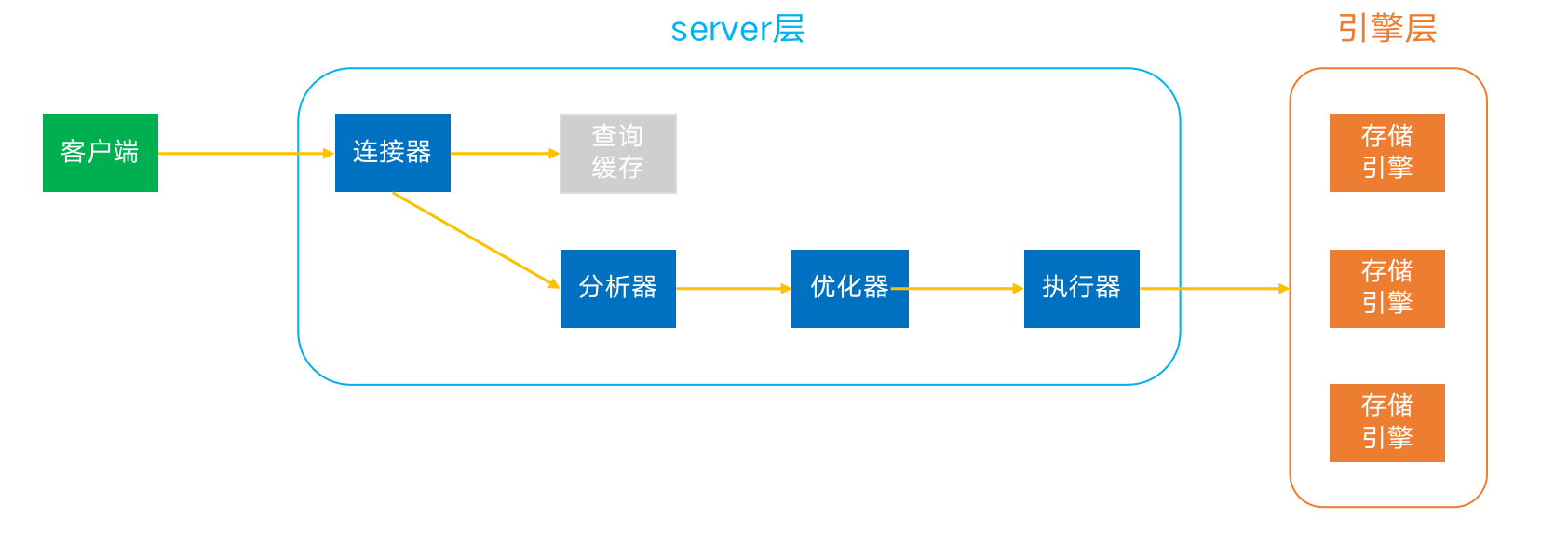 - 查询缓存:查询缓存模块会对整个sql语句的结果做一个缓存。可以看到我图中是用灰色部分标识的主要原因就是性价比不高,不建议设置。(只要表中有一行记录被更新,mysql会清空整个查询缓存,8.0版本以后,mysql已经取消来查询缓存模块)