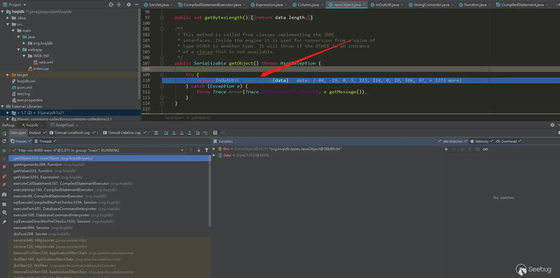 如果还想调试下F5 BIG-IP hsqldb,也是可以的,F5 BIG-IP里面的hsqldb自己加了些代码,反编译他的代码,然后修改反编译出来的代码错误,再重新打包放进去,就可以调试了。