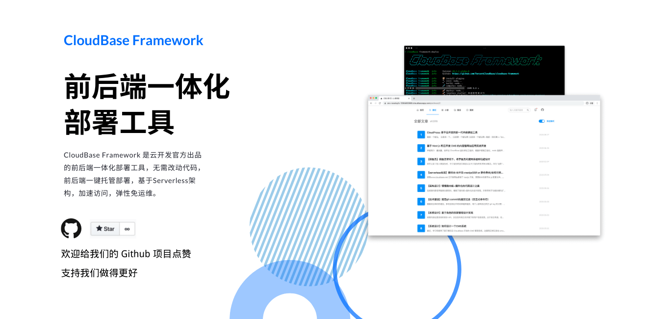 CloudBase Framework 的第一个核心亮点是可以实现一键部署,常见的应用,不需要改动业务代码,即可“零配置”部署到云开发上。